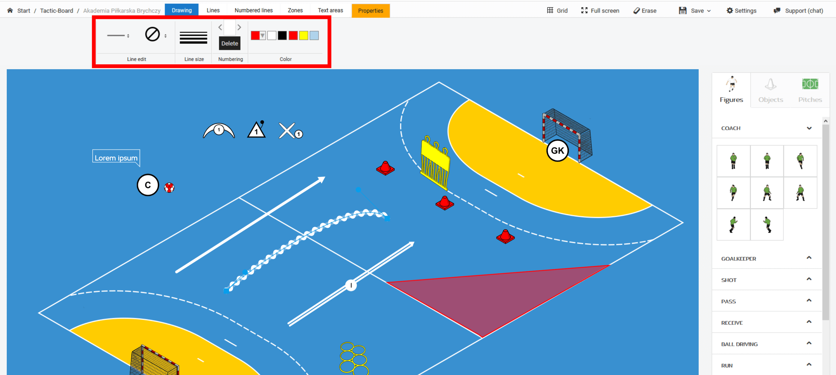 Proces kreslení využívá horní panel nástrojů a pravou nabídku. Pravá nabídka slouží k přidávání prvků na hřiště. Můžete si zde vybrat prvky jako hřiště, hráče a vybavení. Každý z nich se přenáší na hřiště výběrem a označením místa na hřišti, kde se má objevit. Horní panel nástrojů se používá k výběru čar, zón a textových polí. Po výběru objektu se kliknutím myší zobrazí vlastnosti objektu. Zde můžete měnit: velikost, barvu a další parametry charakteristické pro daný objekt. Chcete-li objekt odstranit, klikněte na něj pravým tlačítkem myši a vyberte možnost odstranit z kontextové nabídky. Druhý způsob je kliknout na klávesnici na tlačítko delete.