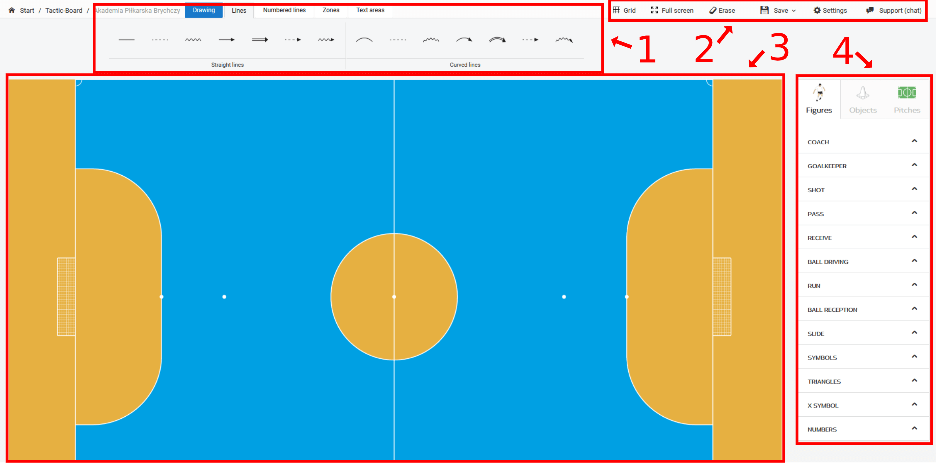 Průvodce se skládá ze čtyř hlavních prvků. 1 - horní panel nástrojů, 2 - horní funkční menu, 3 - pracovní plocha a 4 - pravé menu s objekty a hřišti
