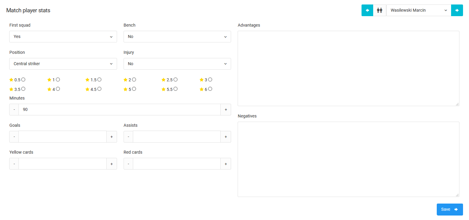 Jak můžete vidět na obrázku výše, můžete ručně zadat individuální statistiky hráčů. Kromě základních údajů, jako jsou vstřelené góly nebo získané body, můžete přidat informace o minutách na hřišti, asistencích a trestech. Navíc můžete hráče ohodnotit za jeho výkon v zápase a popsat klady a zápory jeho hry. Konečným výsledkem vyplněných statistik zápasu je kompletní zápasová reportáž.