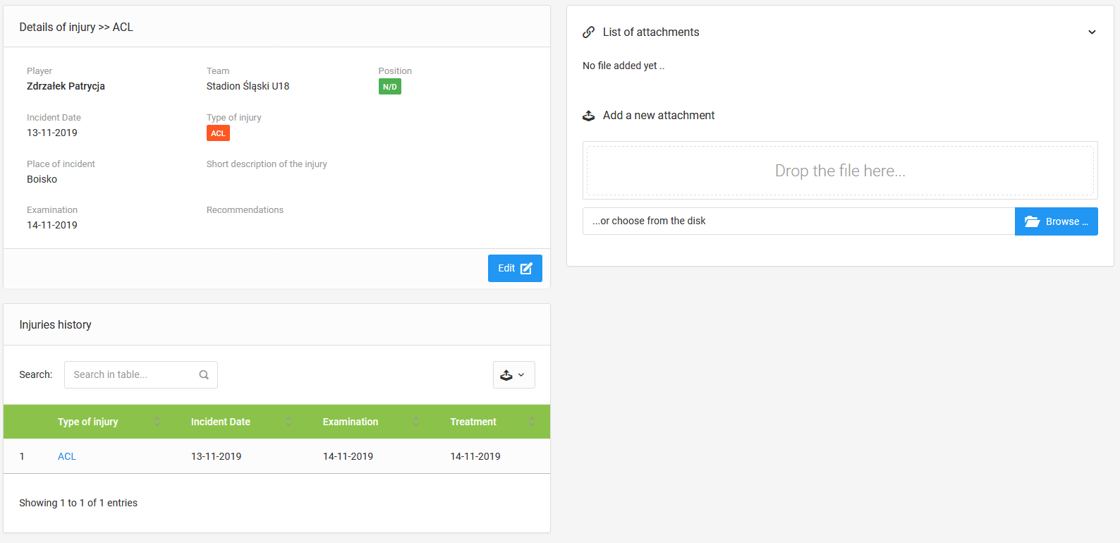 Každé zadané zranění má svou vlastní historii, kde jsou zaznamenány všechny podrobnosti o incidentu. Zde budete moci přidat soubor např. s propouštěcí zprávou z nemocnice nebo rentgenem jako přílohu.