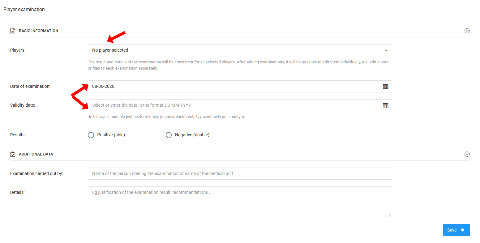 Pro zadání informací o lékařských prohlídkách z levého menu vyberte deník prohlídky přidat prohlídku. Po kliknutí budete přesměrováni na stránku pro zadání informací o prohlídce. Na této stránce budete mít několik důležitých prvků k vyplnění. První je seznam hráčů, kterých se prohlídka týká. Mohou to být všichni hráči, konkrétní skupina nebo jeden hráč. Další důležitá pole jsou: datum prohlídky a datum platnosti prohlídky. Navíc můžete označit výsledek prohlídky (schopen/neschopen) a přidat údaje o osobě provádějící prohlídku.