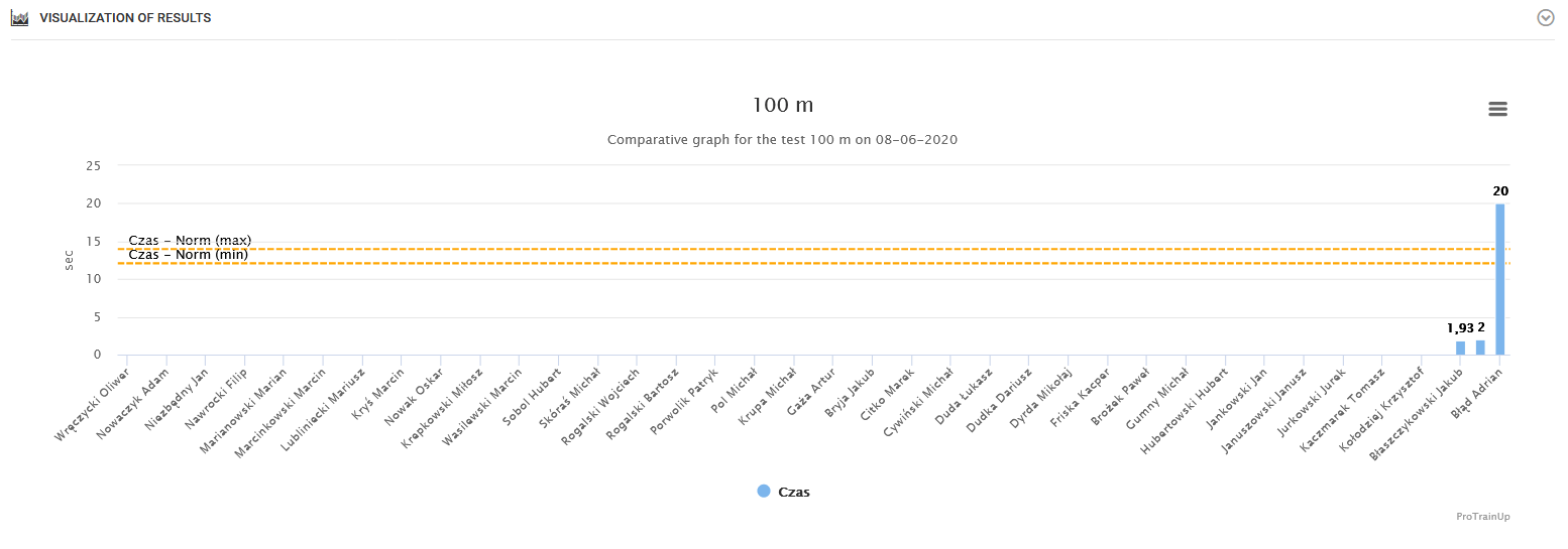 Vyplnění výsledků testu vede k vytvoření reportů v podobě grafických grafů. Pod výsledky každého testu se automaticky vytvoří žebříček daného měření ve formě sloupcového grafu. Navíc se pro každého soutěžícího zvlášť generuje historie měření daného testu. Graf zobrazující historii výsledků daného hráče.
