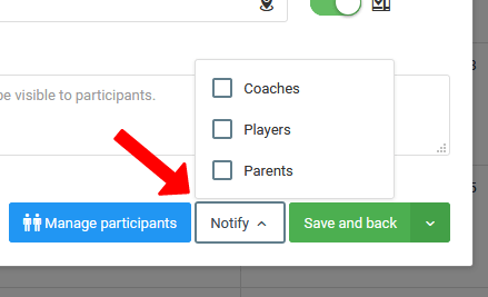 Při vytváření tréninku máte možnost nastavit seznam účastníků (hráčů) a trenérů (personálu). Vybraný seznam hráčů bude odpovídat seznamu hráčů v prezenční listině při jejím kontrolování. Seznam trenérů označených jako personál konkrétního tréninku se zobrazí na návrhu. Odtud máte také možnost povolat hráče z jiného týmu na plánovaný trénink. Oznámení účastníkům o tréninku je založeno na výběru uživatelských skupin, kterým bude oznámení odesláno. Zobrazí se jak v mobilní aplikaci, tak v online verzi systému.