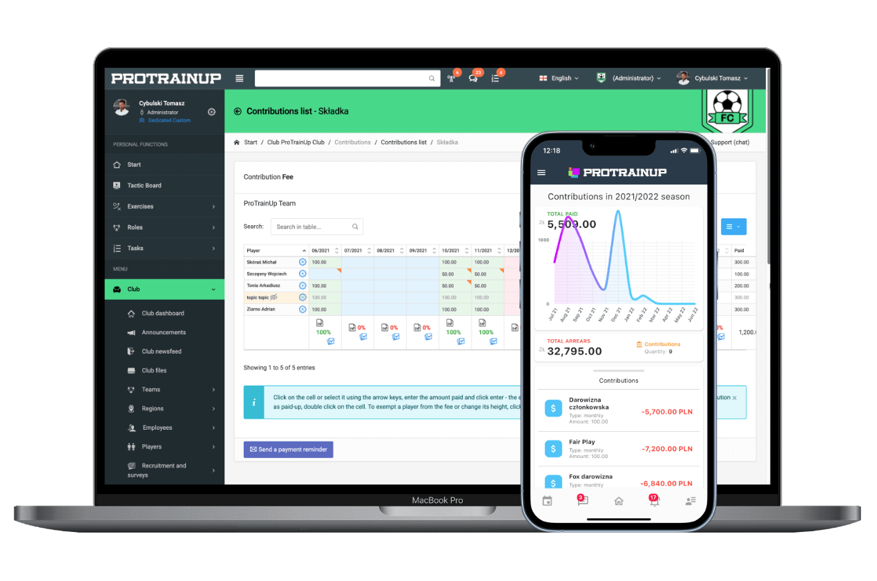 Dzięki możliwościom jakie daje ProTrainUp jesteś w stanie zarządzać kadrami, kontrolować składki, budować bazę ćwiczeń czy sprawdzać frekwencję na treningach, przy pomocy kilku kliknięć!