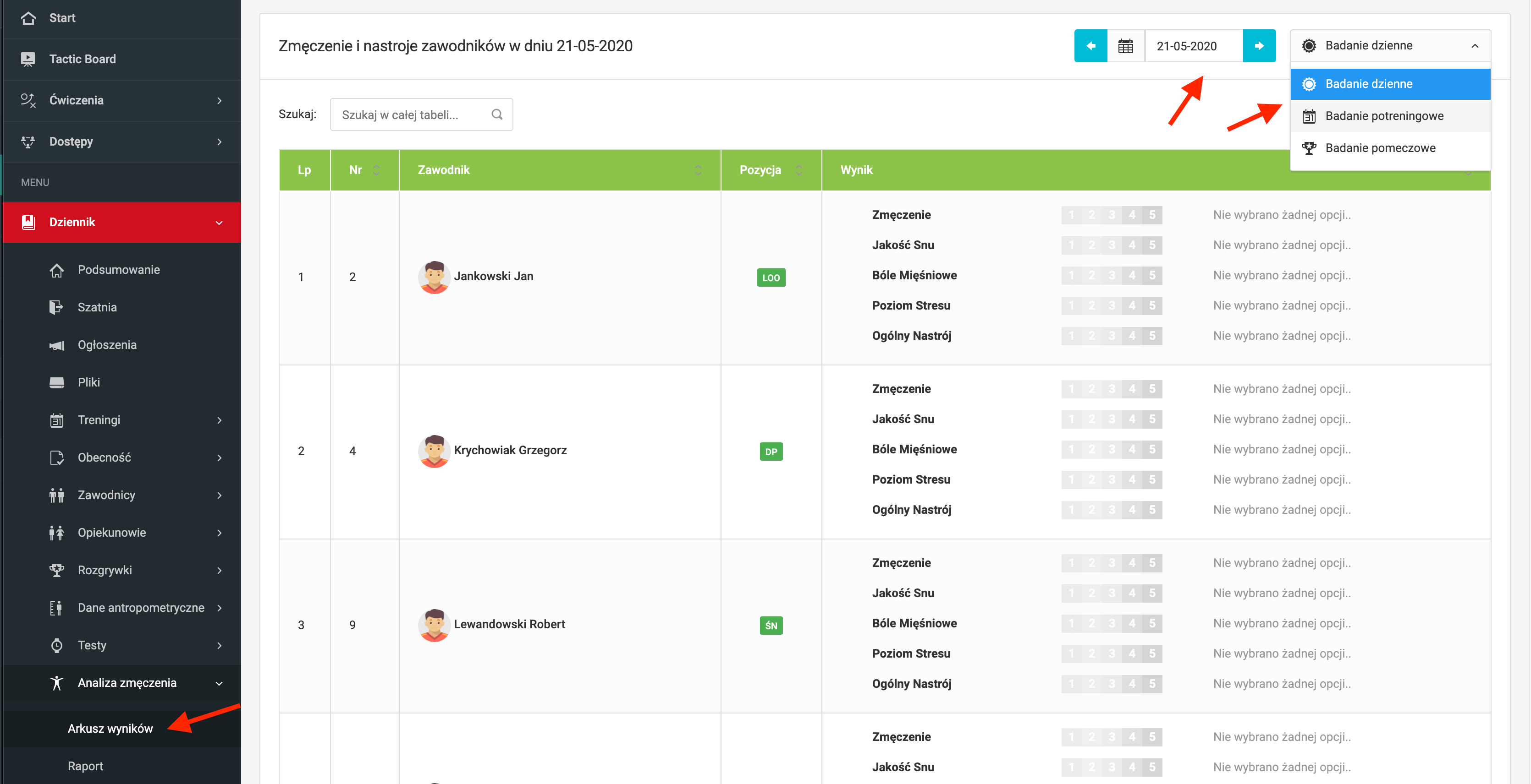 W wyjątkowych sytuacjach kiedy zawodnicy nie przekazują danych przez aplikację mobilną, masz możliwość ich ręcznego wpisania poprzez system. Aby to zrobić wybierz z lewego menu dziennik analiza zmęczenia arkusz wyników.