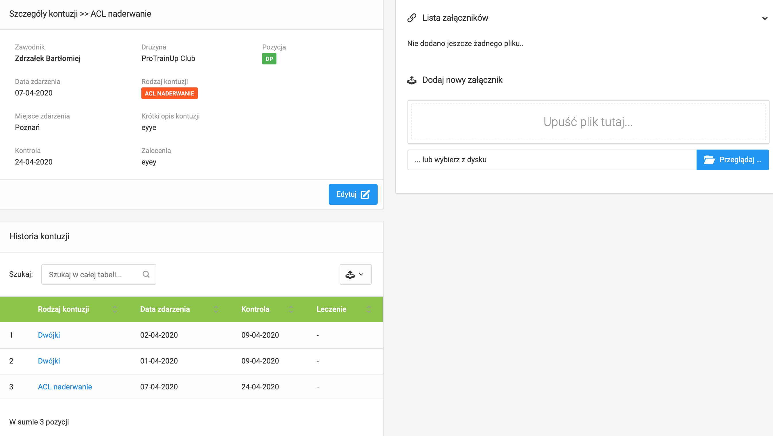 Każda wprowadzona kontuzja ma swoją kartotekę, w której dostępne są wszystkie szczegóły dotyczące danego zdarzenia. W tym miejscu będziesz mógł, jako załącznik dodać plik zawierający np. wypis ze szpitala czy zdjęcie rentgenowskie.