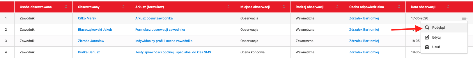 Aby wejść do podglądu danej obserwacji, przejdź w lewym menu do zakładki Klub Oceny i obserwacja Lista obserwacji. Następnie w tabeli, którą zobaczysz na stronie, znajdź interesującą Cię obserwację i w ostatniej kolumnie z menu wybierz opcję „podgląd”. Z tego też miejsca możesz edytować przeprowadzoną obserwację oraz usunąć ją z listy.