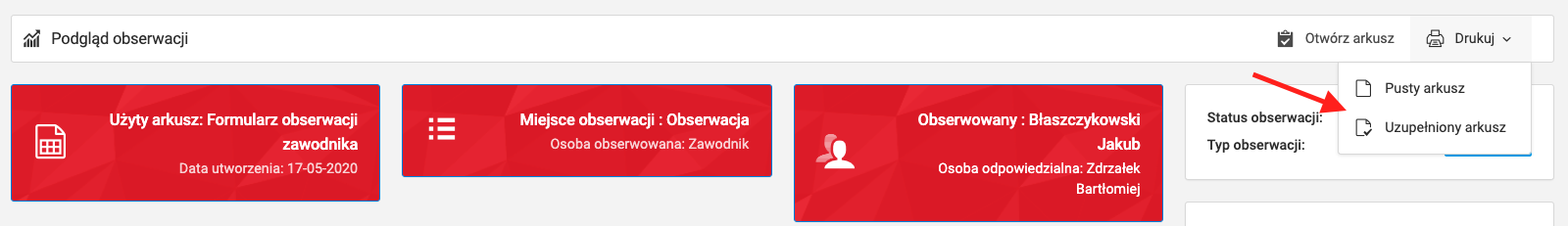 Jak już wspominaliśmy w rozdziale na temat obserwacji, w podglądzie obserwacji znajdziesz zestawienie najważniejszych informacji na temat przeprowadzonej oceny. W górnej części strony znajdziesz dane począwszy od informacji na temat typu obserwacji, przez info na temat tego kto był obserwowany, a kończąc na tym jaki arkusz był do tej obserwacji wykorzystany. W prawym górnym rogu ekranu znajdziesz tak przycisk „Drukuj”. Po kliknięciu będziesz miał możliwość pobrania pustego lub uzupełnionego arkusza w postaci pliku PDF.