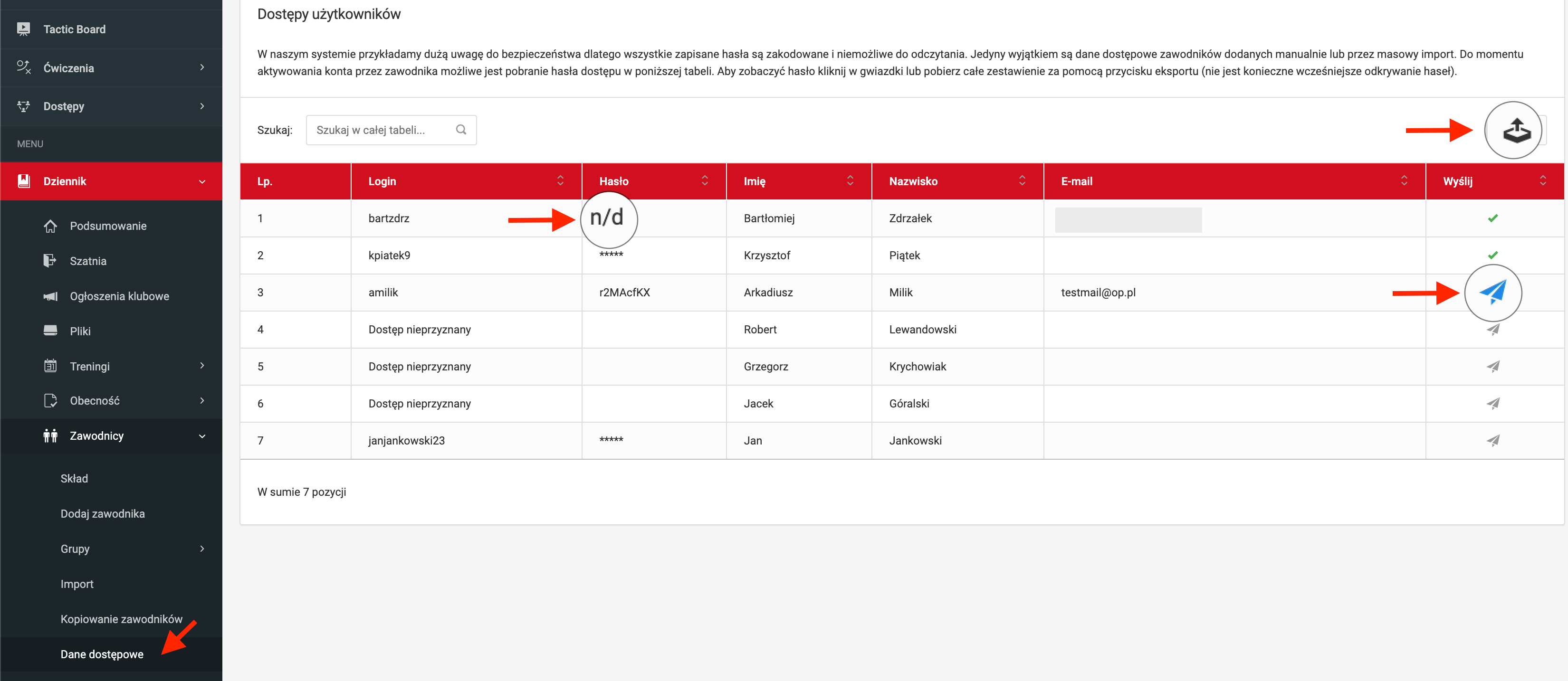 Jeżeli dodajesz zawodników lub opiekunów pojedynczo, dane dostępowe automatycznie zostaną wysłane na wskazany podczas tworzenia konta adres e-mail. Jednakże w przypadku masowego dodawania zawodników i opiekunów, proces przekazywania wygląda nieco inaczej. Zarówno w przypadku zawodników, jak i opiekunów znajdziesz w lewym menu zakładkę "dane dostępowe". Jest to miejsce, gdzie znajdziesz wszystkie loginy i hasła pierwszego logowania swoich zawodników oraz ich opiekunów.