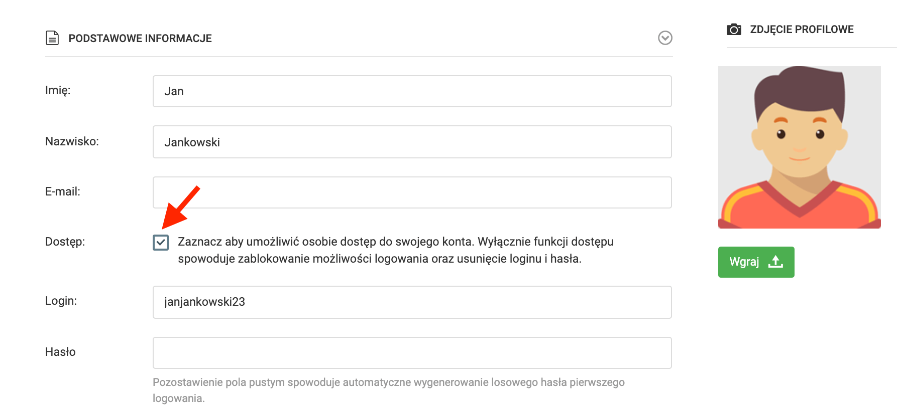 a także będziesz mógł zmienić dane takie jak: imię, nazwisko czy e-mail. Z tego też miejsca możesz nadać zawodnikowi dostęp do systemu. Wystarczy, że zaznaczysz szary checkbox, a system wygeneruje dla zawodnika login i hasło. Profil może być także edytowany przez rodzica zawodnika.
