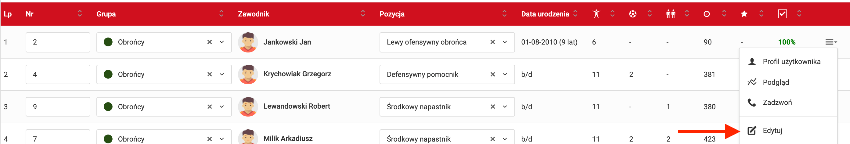Aby edytować profil zawodnika, kliknij w pozycję "edytuj" w menu funkcyjnym przy danym graczu. Z tego miejsca będziesz miał możliwość dodania zdjęcia gracza,