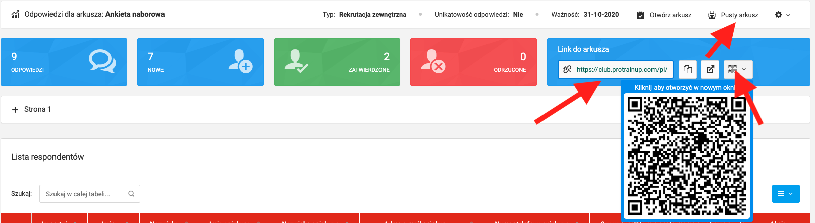 Aby pobrać link, wejdź na listę arkuszy, następnie kliknij w nazwę danego arkusza. Zostaniesz przeniesiony na stronę detali danego formularza i w jej prawej stronie znajdziesz pole „link do arkusza”. Po lewej przykładowa integracja ze stroną www. Możesz także pobrać indywidualny dla danej ankiety kod QR, który możesz umieścić w dowolnych materiałach drukowanych takich jak ulotki czy plakaty.