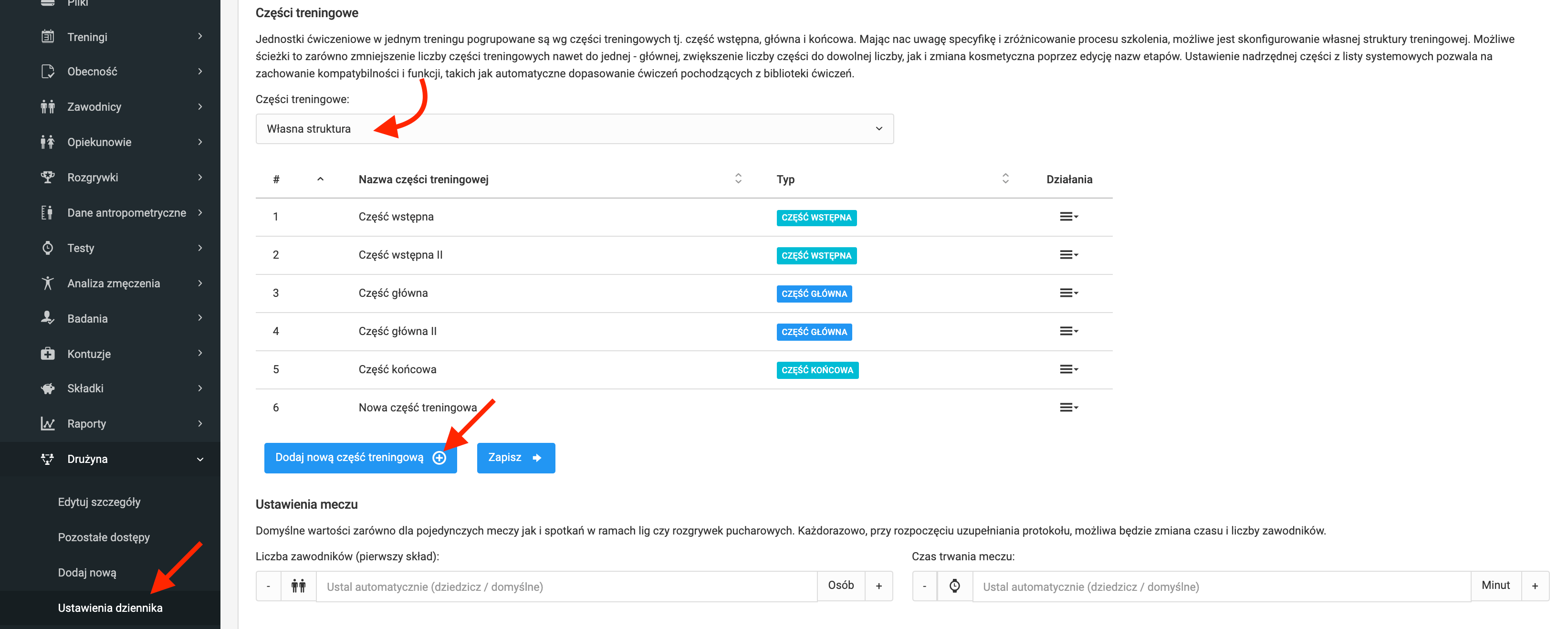 System daje możliwość utworzenia swojej własnej struktury konspektu. Domyślnie na konspekcie są trzy części treningowe: cześć wstępna, główna i końcowa. Dzięki tej możliwości możesz ustalić dowolną ilość i kolejność części treningu. Części mogą zostać ustalone odgórnie z poziomu klubu, a następnie dziedziczone przez drużyny lub utworzone indywidualnie dla konkretnej drużyny. Własną strukturę konspektu ustalamy w zakładce dziennik drużyna ustawienia dziennika.