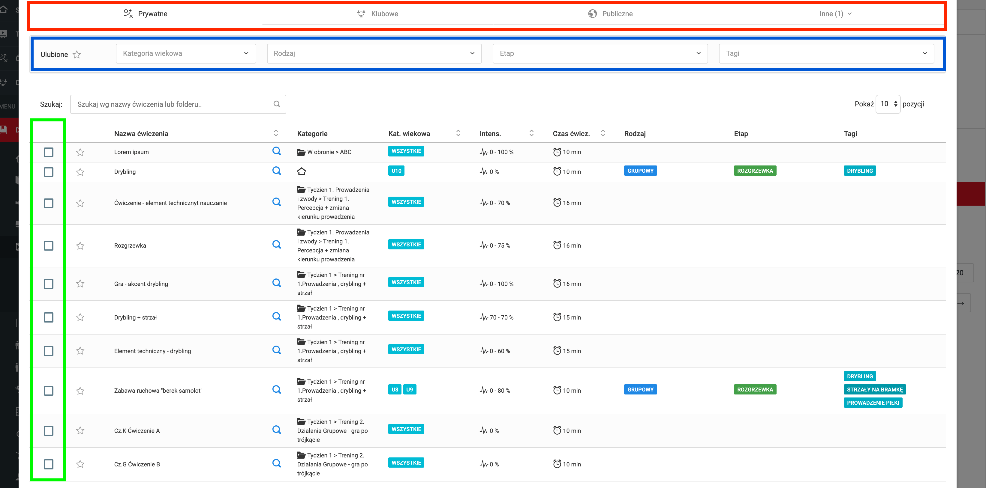 Okno dodawania ćwiczeń składa się z czterech zasadniczych elementów. Pierwszy (czerwony) to lista dostępnych bibliotek. W zależności od posiadanej licencji, mogą to być dwie, trzy, a nawet cztery biblioteki. Kolejnym elementem (niebieski) są filtry, dzięki nim będziesz mógł szybciej znaleźć interesujące Cię ćwiczenie. Następny element (zielony), to checkbox'y które zaznaczasz, aby dodać ćwiczenia do konspektu. Pozostały obszar to lista dostępnych ćwiczeń wraz z ich parametrami.