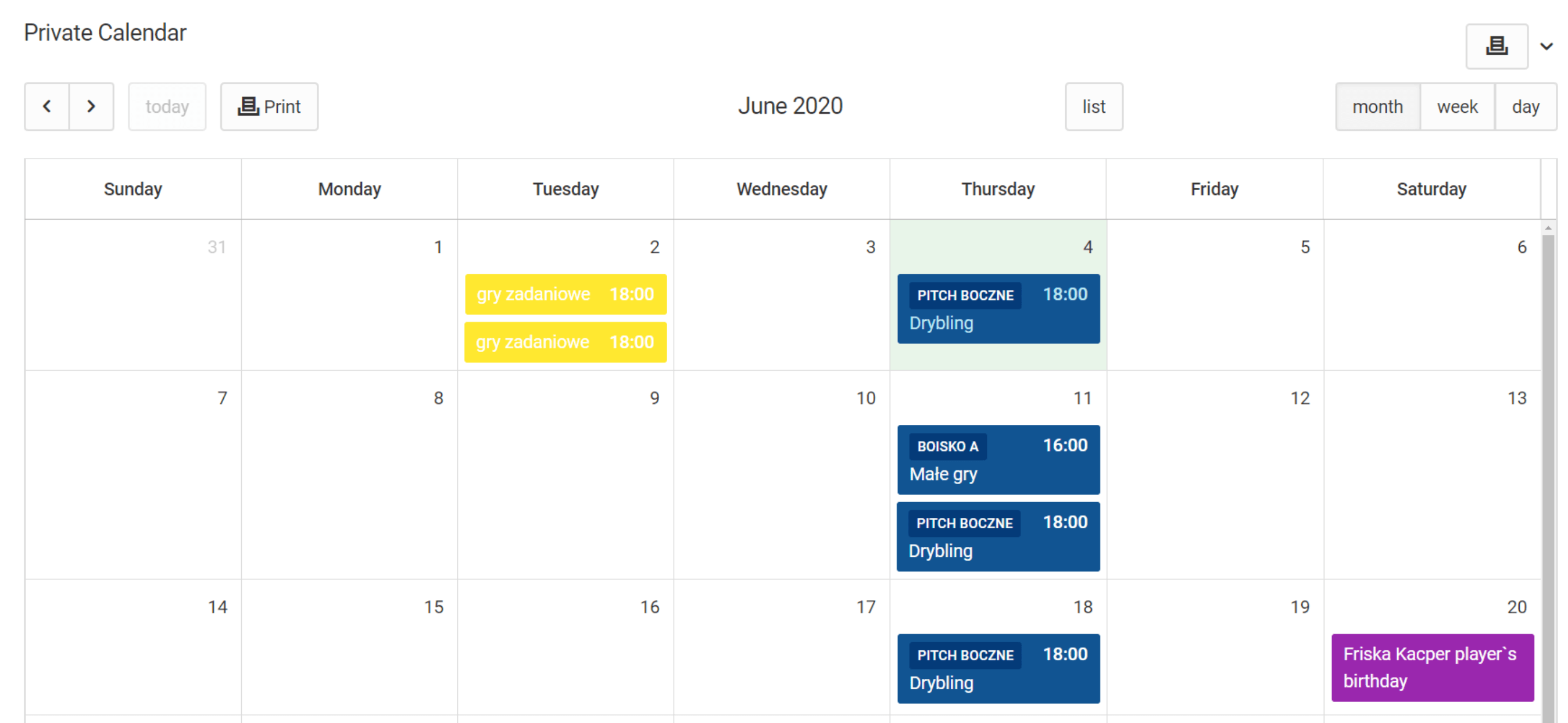 Zasebni koledar je privzeto mesto, na katerega boste preusmerjeni, ko se prijavite v sistem. V tem koledarju lahko vidite vse dogodke, tekme in treninge, ki vas zadevajo, ne glede na vašo trenutno aktivno vlogo. To pomeni, da če ste trener treh ekip, bo koledar prikazal urnike, urnike tekem in dogodkov za tri ekipe, ki jih vodite in druge osebne vnose.